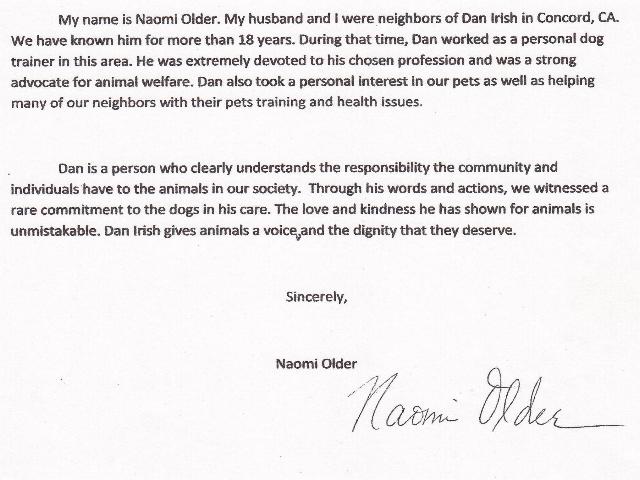 My name is Naomi Older. My husband and I were neighbors of Dan Irish in Concord, California. We have known him for more than 18 years. During that time, Dand worked as a personal dog trainer in this area. He was extreemly devoted to his chosen profession and was a strong advocated for animal welfare. Dan also took a personal interest in our pets as well as helping many of our neighbors with their training and health issues,